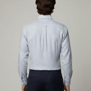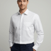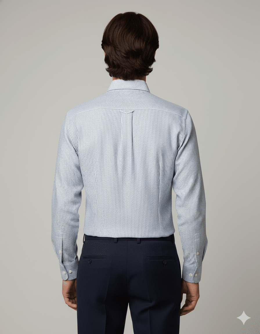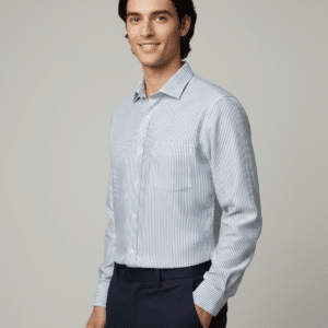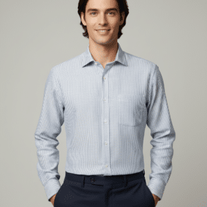 The subtle blue and white vertical stripes create a clean, elongated silhouette, offering a crisp yet relaxed aesthetic suitable for executive casuals, resort wear, and premium office styling. Precision tailoring ensures a sharp regular fit, complemented by a structured collar, smooth button placket, and a neatly finished chest pocket for a touch of understated luxury.