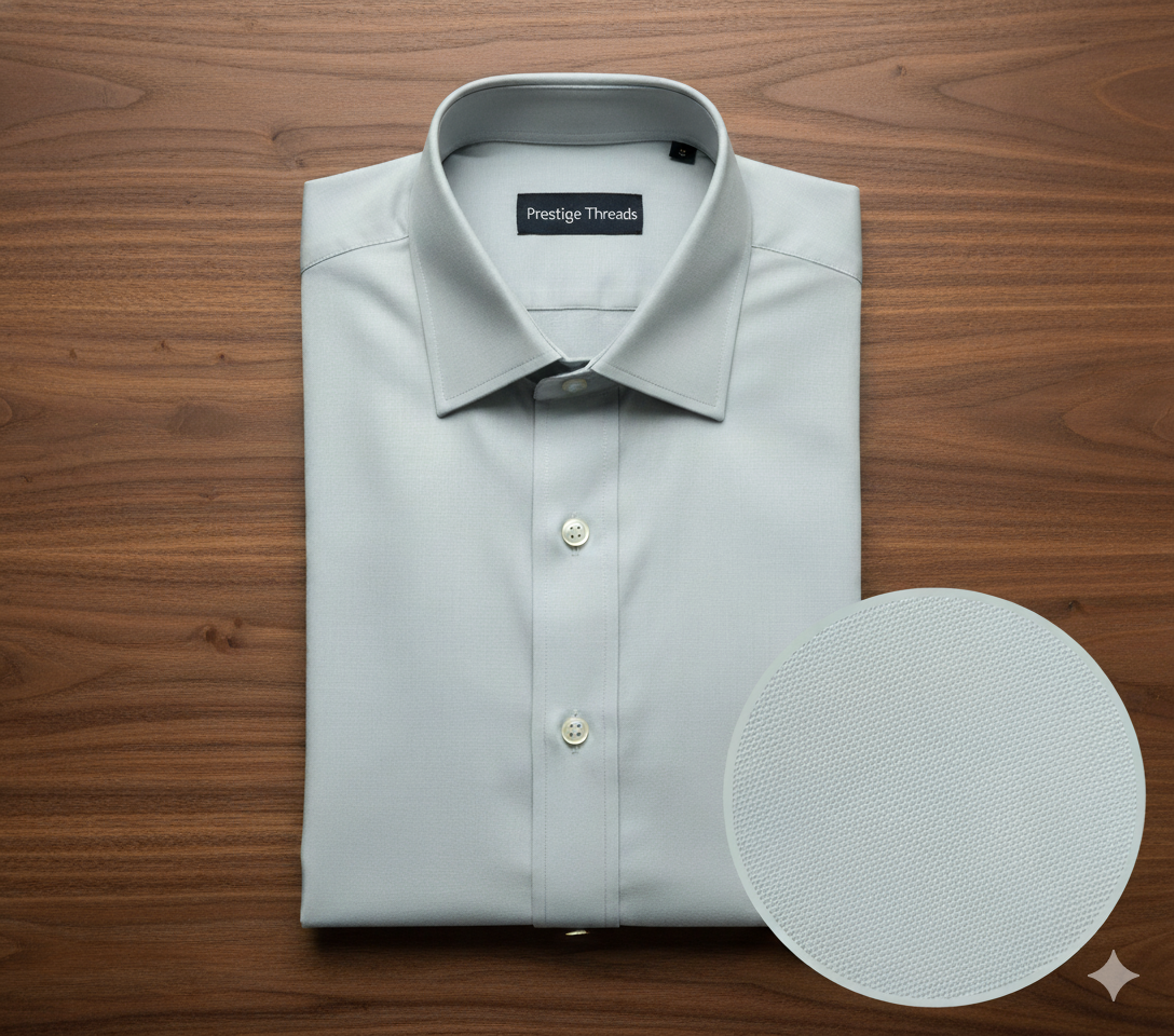 Made from a high-quality cotton-blend fabric, the shirt features a smooth, micro-textured weave as shown in the fabric swatch. This ensures breathability, durability, and a polished finish. The structured collar, premium buttons, and precision stitching highlight the craftsmanship, giving you a clean and professional appearance.