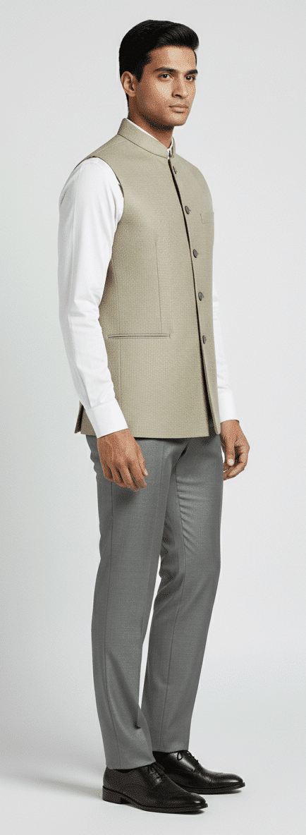 Elevate your ethnic and formal wardrobe with this Classic Beige Nehru Jacket, designed for the modern gentleman who appreciates timeless Indian elegance. Crafted with a structured silhouette and a refined bandhgala collar, this jacket blends traditional style with contemporary tailoring. The subtle beige tone adds a sophisticated charm, making it a versatile piece that pairs effortlessly with shirts, kurtas, or formal trousers for weddings, festive occasions, and special celebrations.
