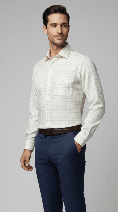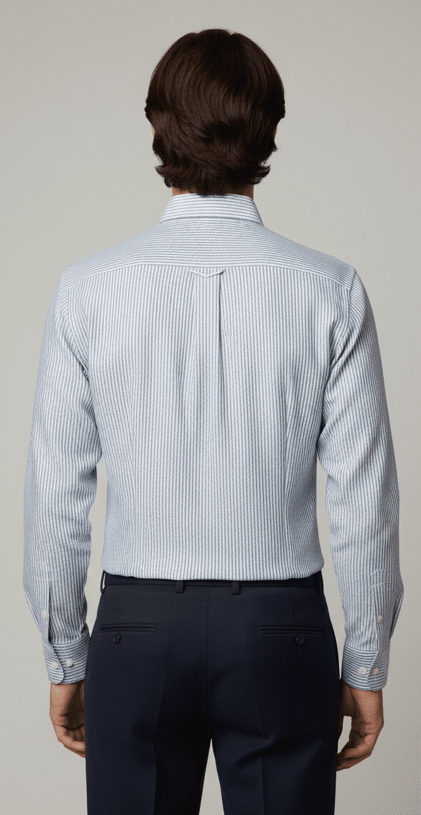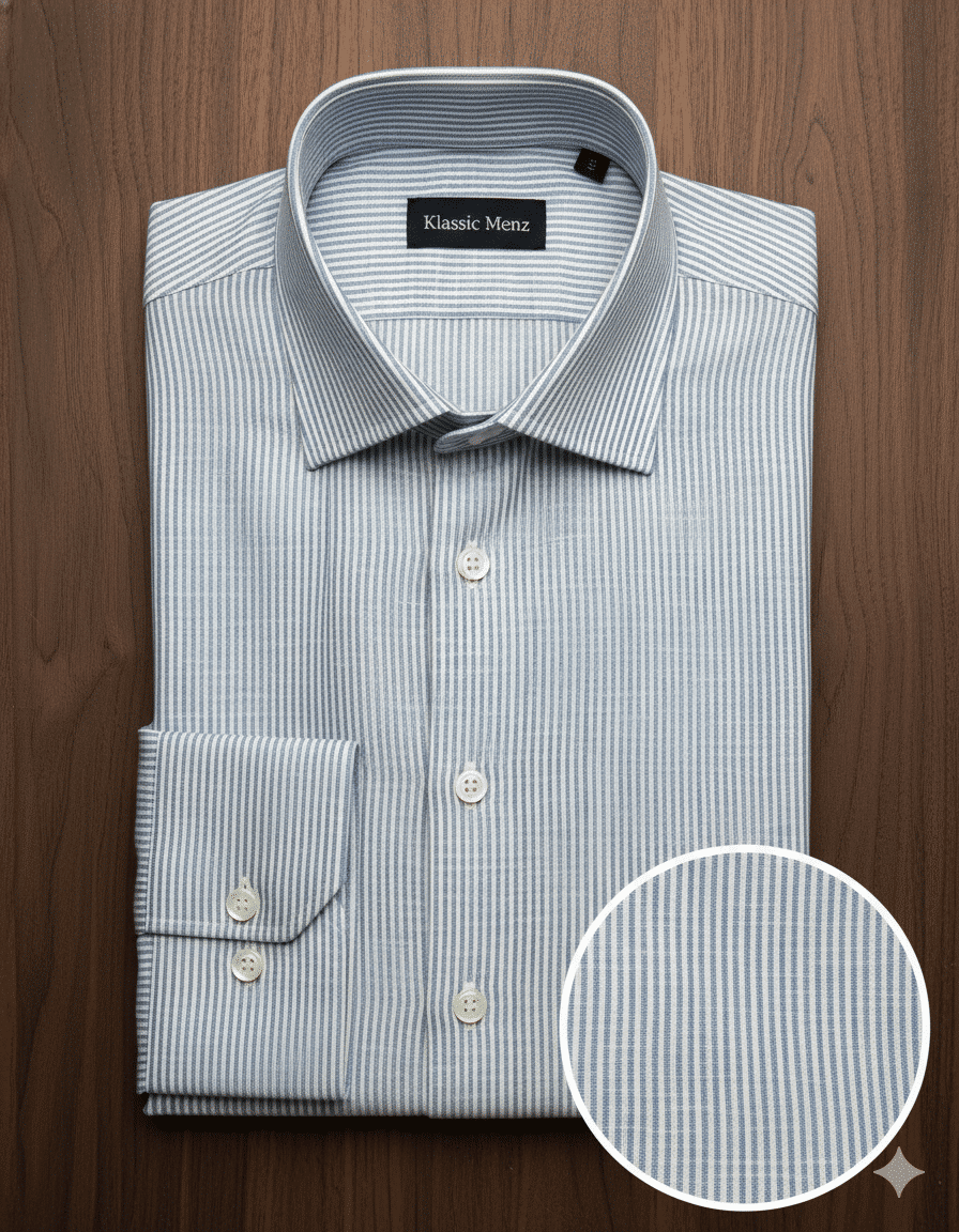 The subtle blue and white vertical stripes create a clean, elongated silhouette, offering a crisp yet relaxed aesthetic suitable for executive casuals, resort wear, and premium office styling. Precision tailoring ensures a sharp regular fit, complemented by a structured collar, smooth button placket, and a neatly finished chest pocket for a touch of understated luxury.