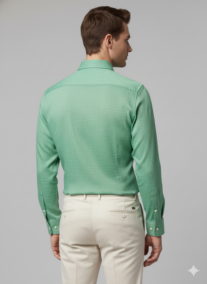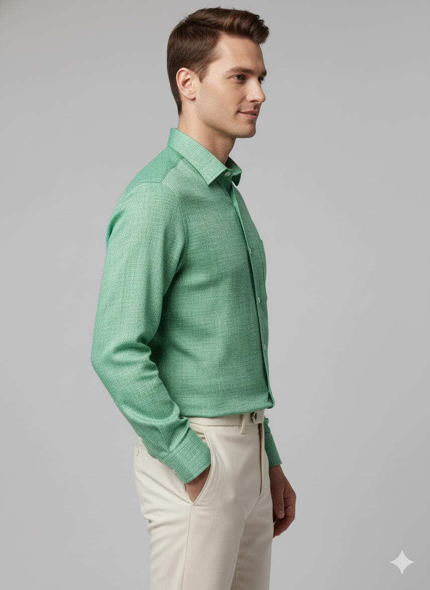 Refresh your wardrobe with this mint green textured linen shirt, crafted for men who appreciate effortless style and breathable comfort. The subtle woven texture adds a refined depth to the fabric, giving the shirt a premium, modern look perfect for both everyday wear and polished semi-formal occasions.