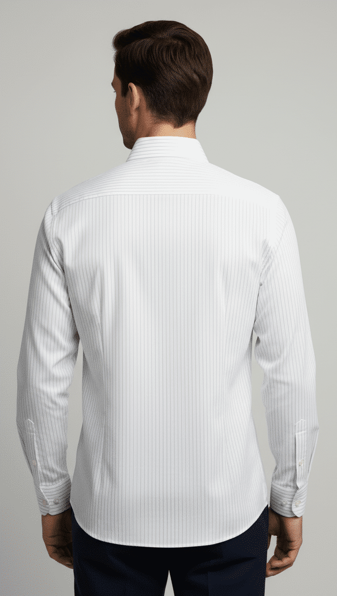 The delicate vertical stripe pattern adds depth and sophistication to the classic white palette, creating a clean, elongating silhouette ideal for executive offices, boardroom meetings, and high-end formal occasions. Expert tailoring ensures a sharp, structured fit, while the precision-cut collar, premium buttons, and refined stitching reflect exceptional craftsmanship.
