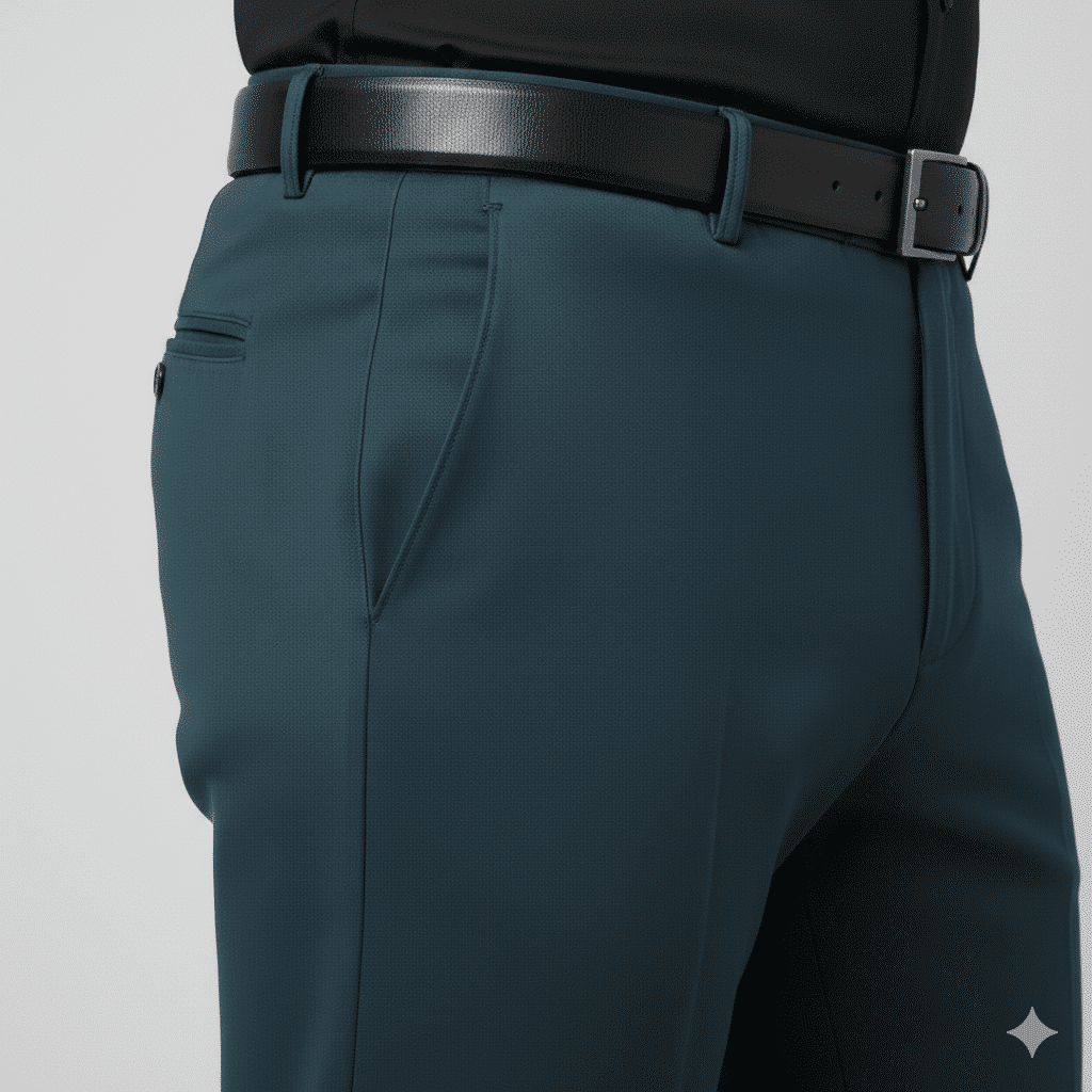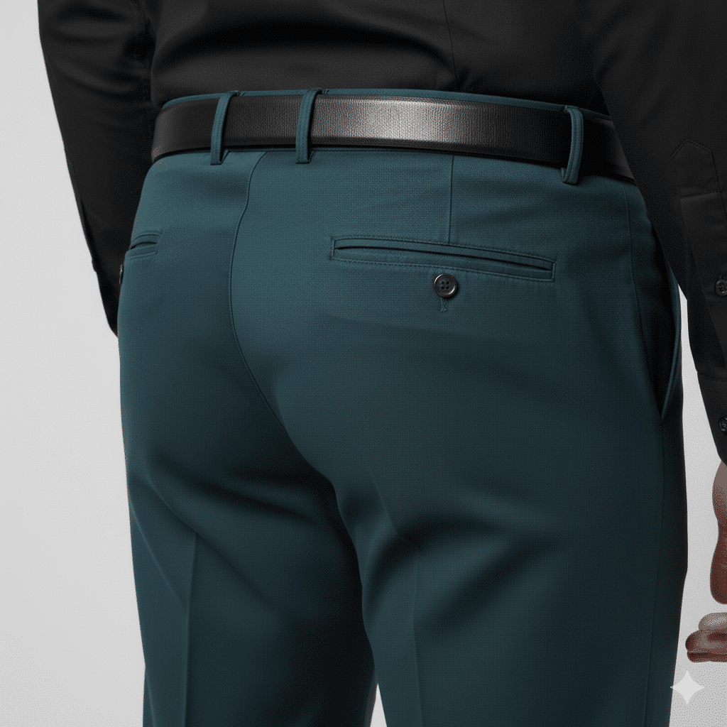 The fabric showcases a rich teal-green tone with subtle blue undertones, giving it a premium, modern appeal that stands out while remaining formal. Available in both Slim Fit and Regular Fit, this trouser is designed to suit different body types and styling preferences.