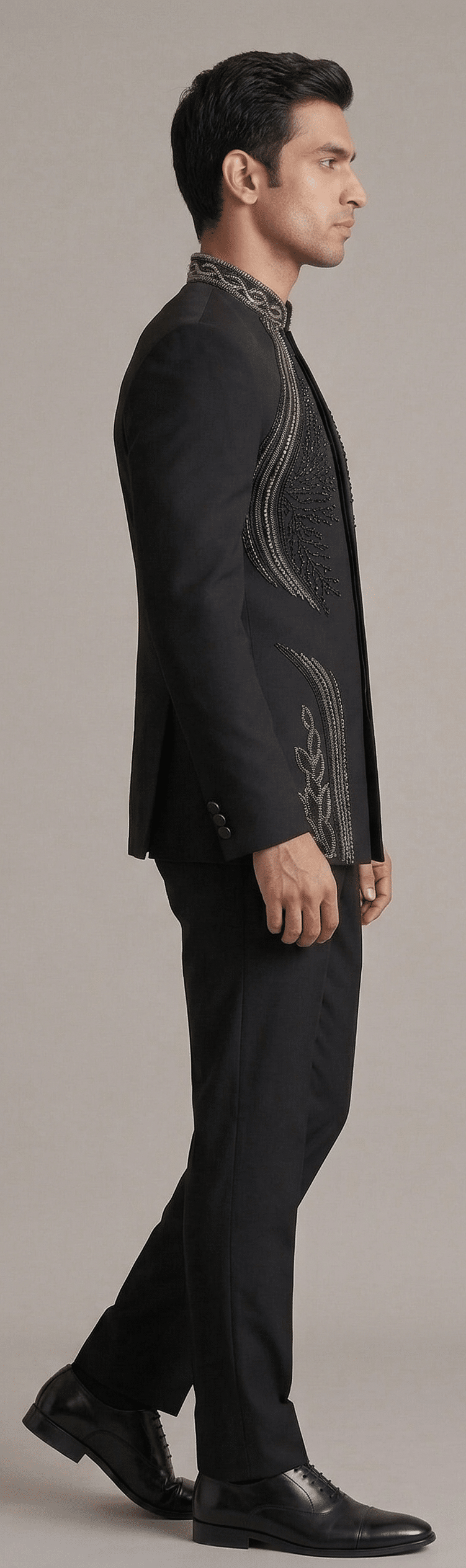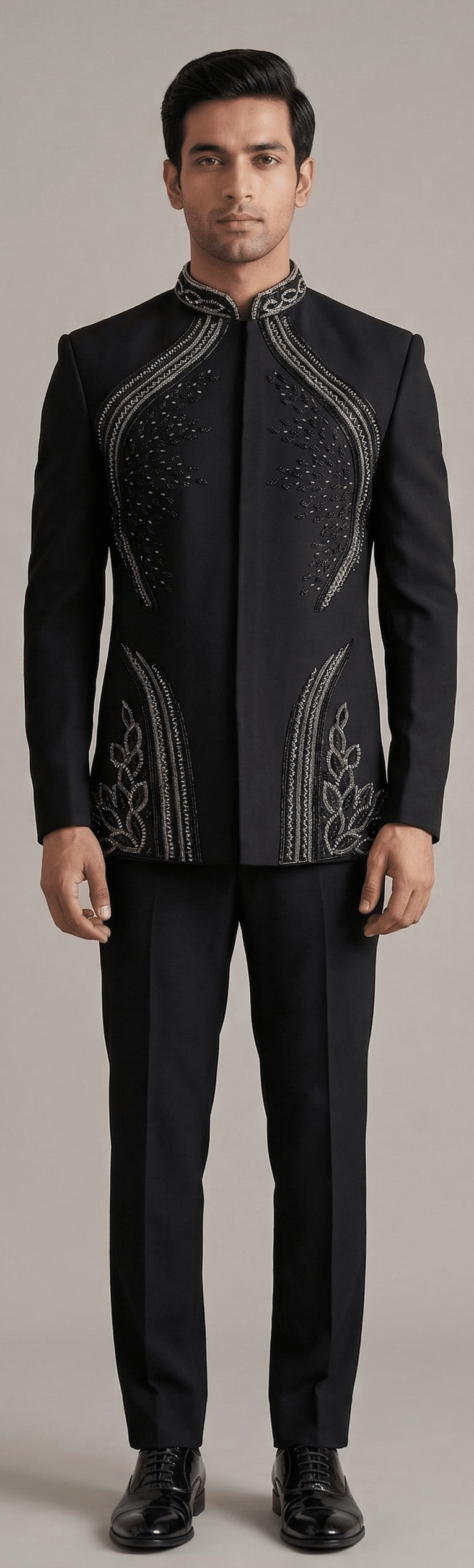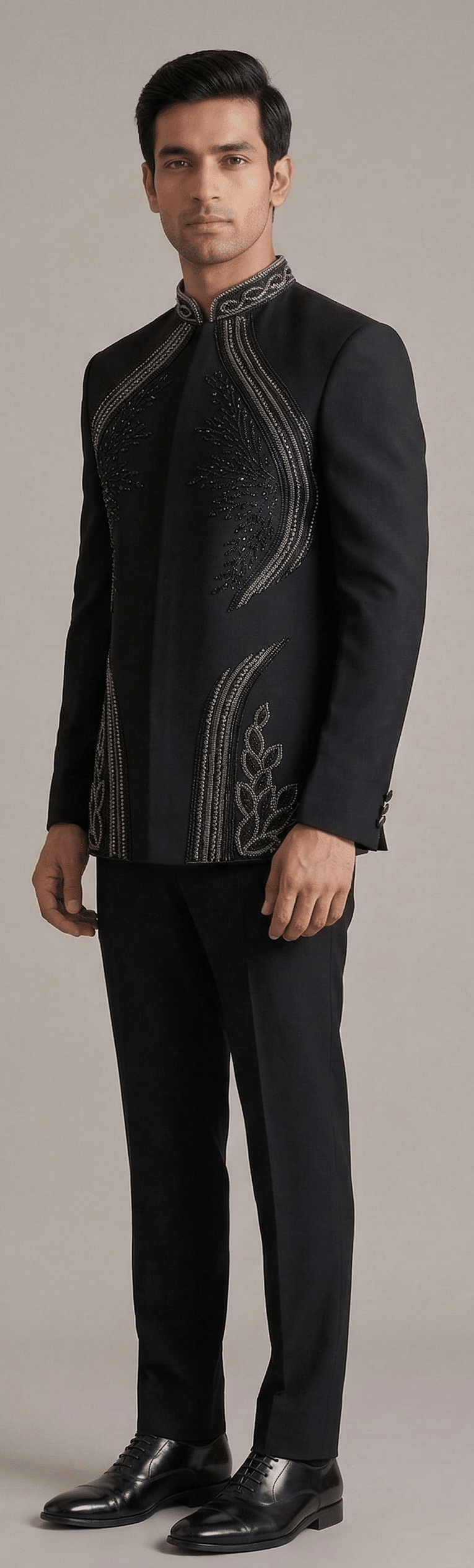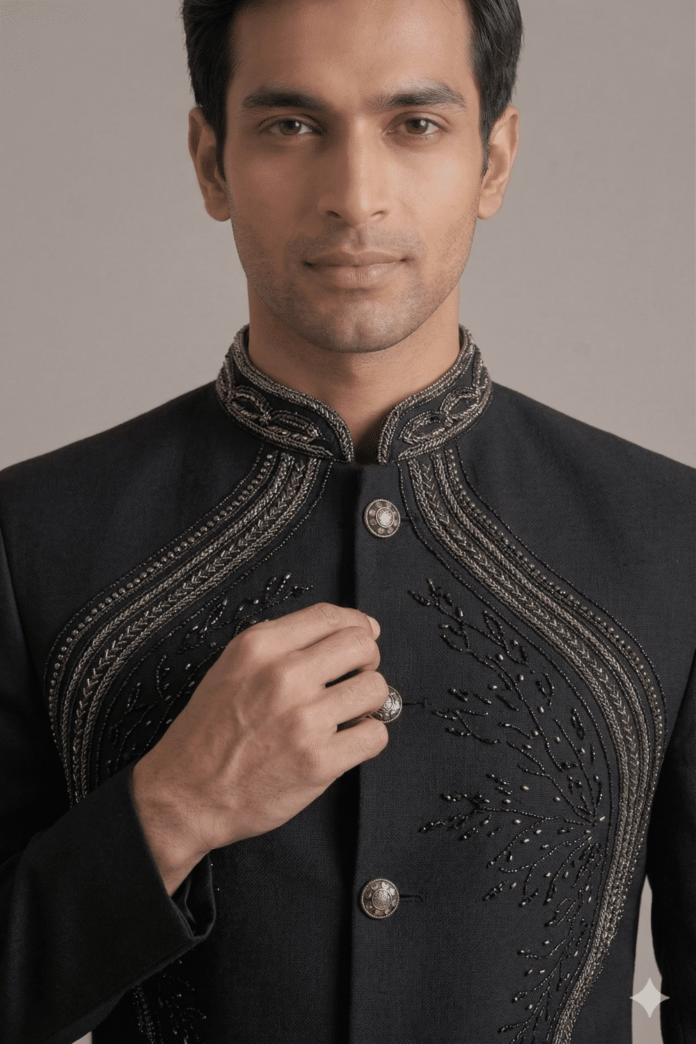 The structured bandhgala (closed neck) silhouette enhances your overall presence, giving you a sharp, confident look. The detailed embroidery flowing across the chest and sides adds depth and a luxurious feel without overpowering the elegance—making it ideal for weddings, receptions, cocktail events, and grand celebrations.
