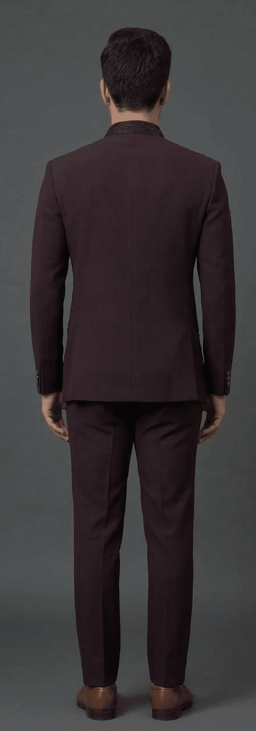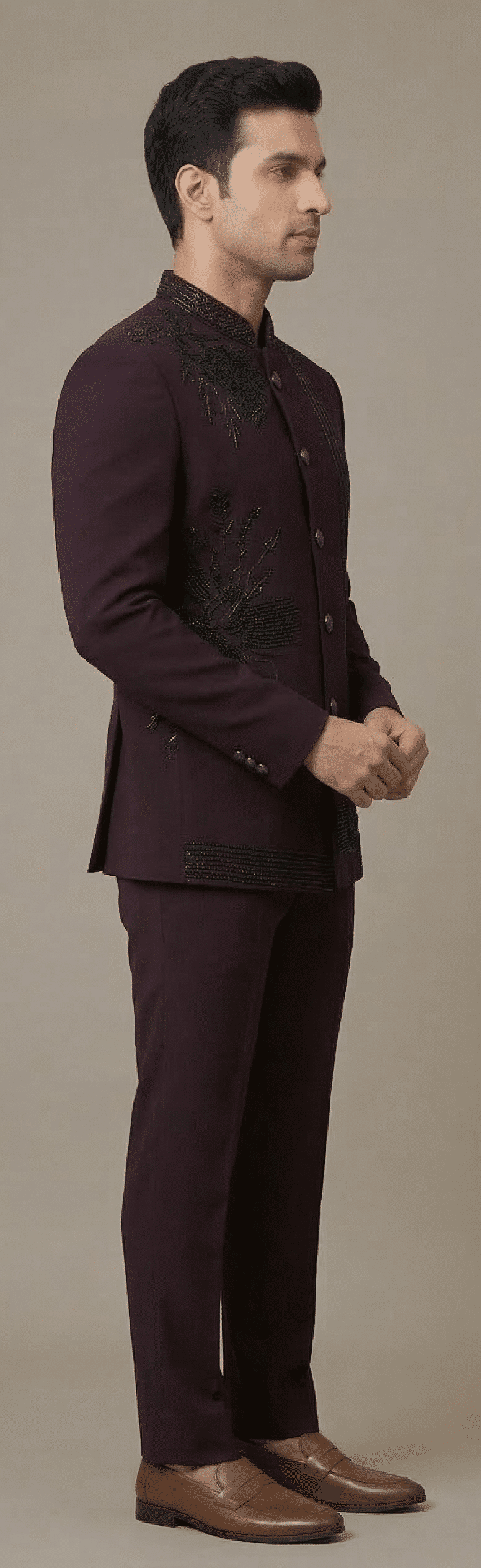 Step into refined elegance with the Royal Burgundy Ember Jodhpuri Suit, a masterpiece crafted for men who appreciate luxury, heritage, and powerful style. Designed in a deep royal burgundy shade, this premium bandhgala suit features intricate tonal embroidery that adds depth, texture, and a striking visual appeal.