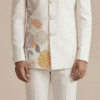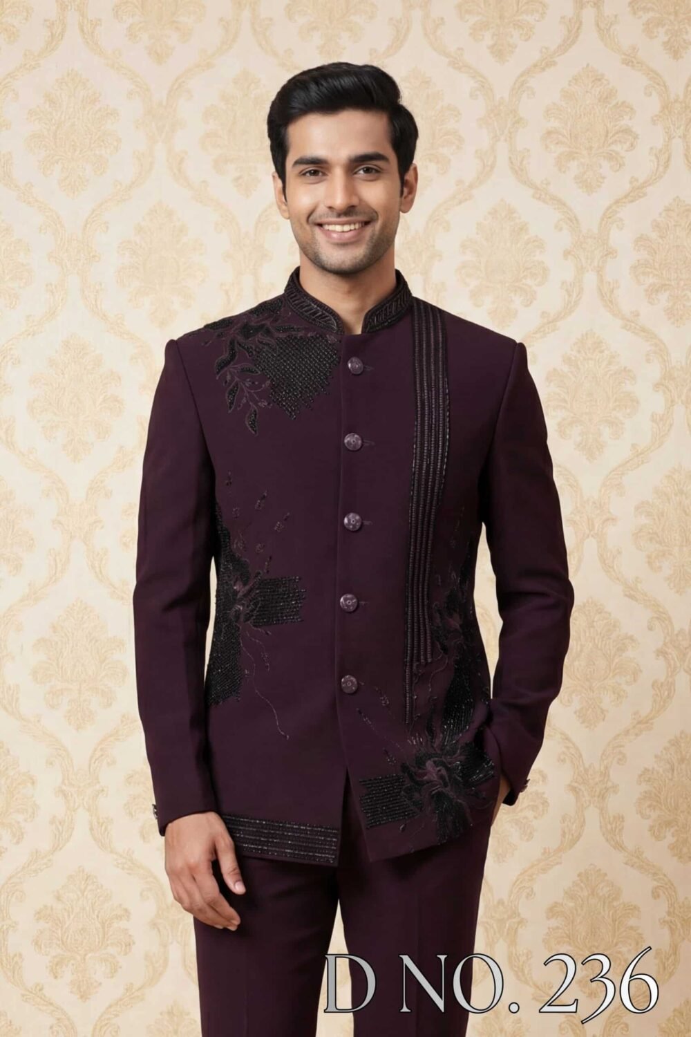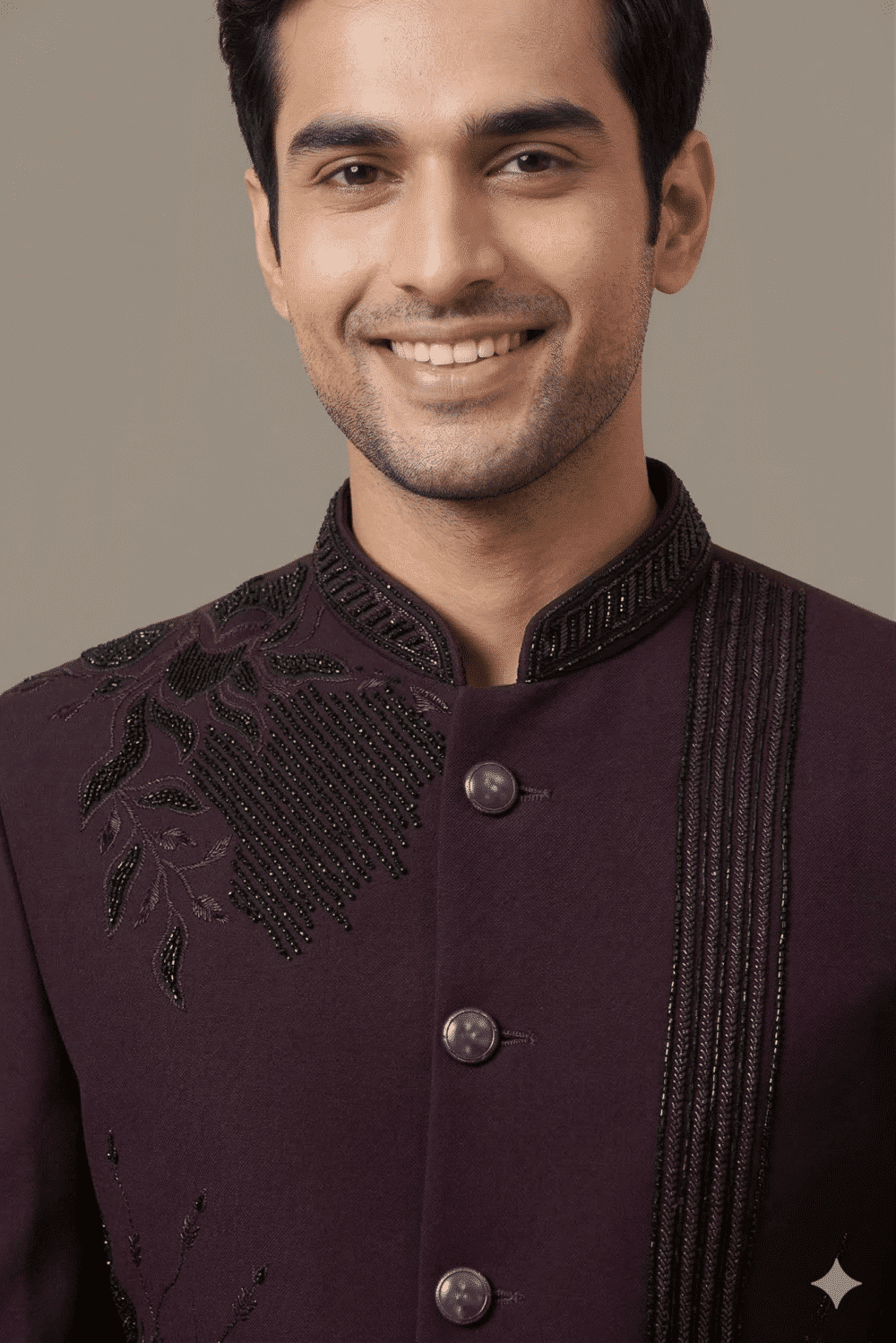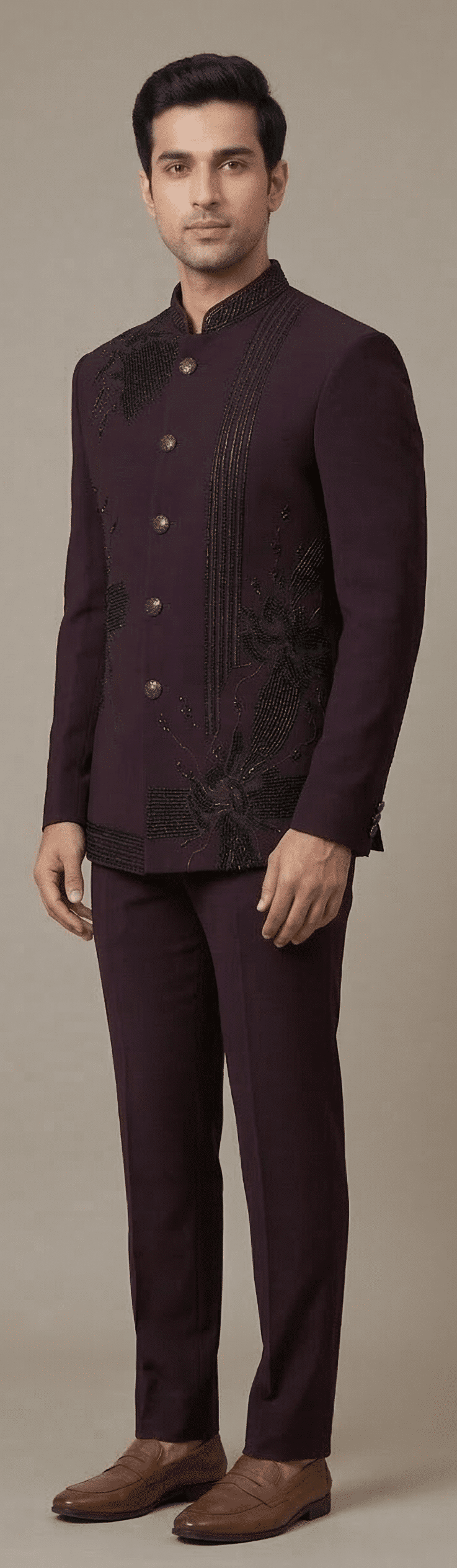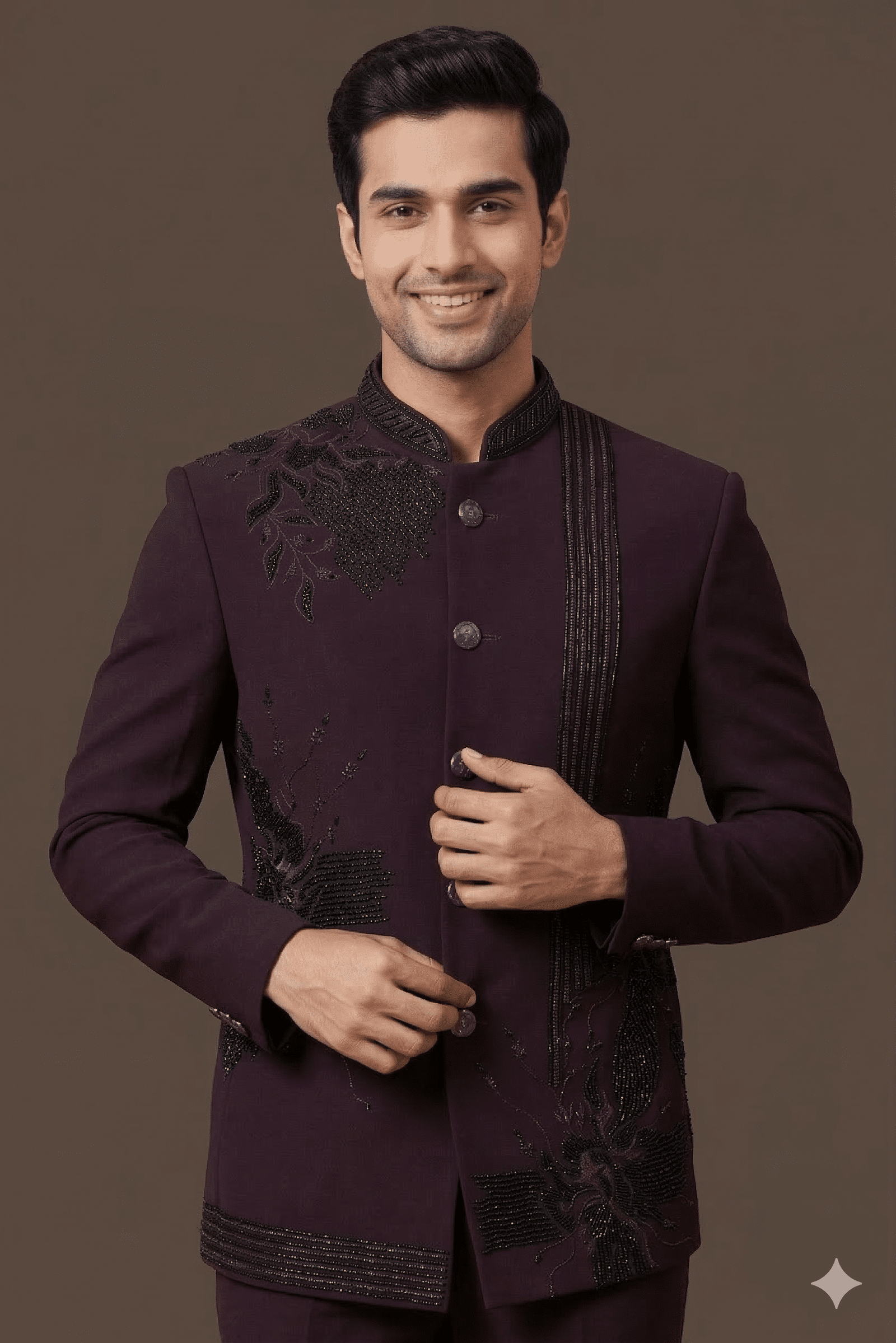 The elegant mandarin bandhgala collar paired with a clean structured silhouette enhances the royal aesthetic while maintaining a modern and sophisticated look. The detailed embroidery flowing across the shoulder and lower panel creates a distinctive statement design, making this suit a perfect choice for weddings, receptions, engagement ceremonies, and festive celebrations.
