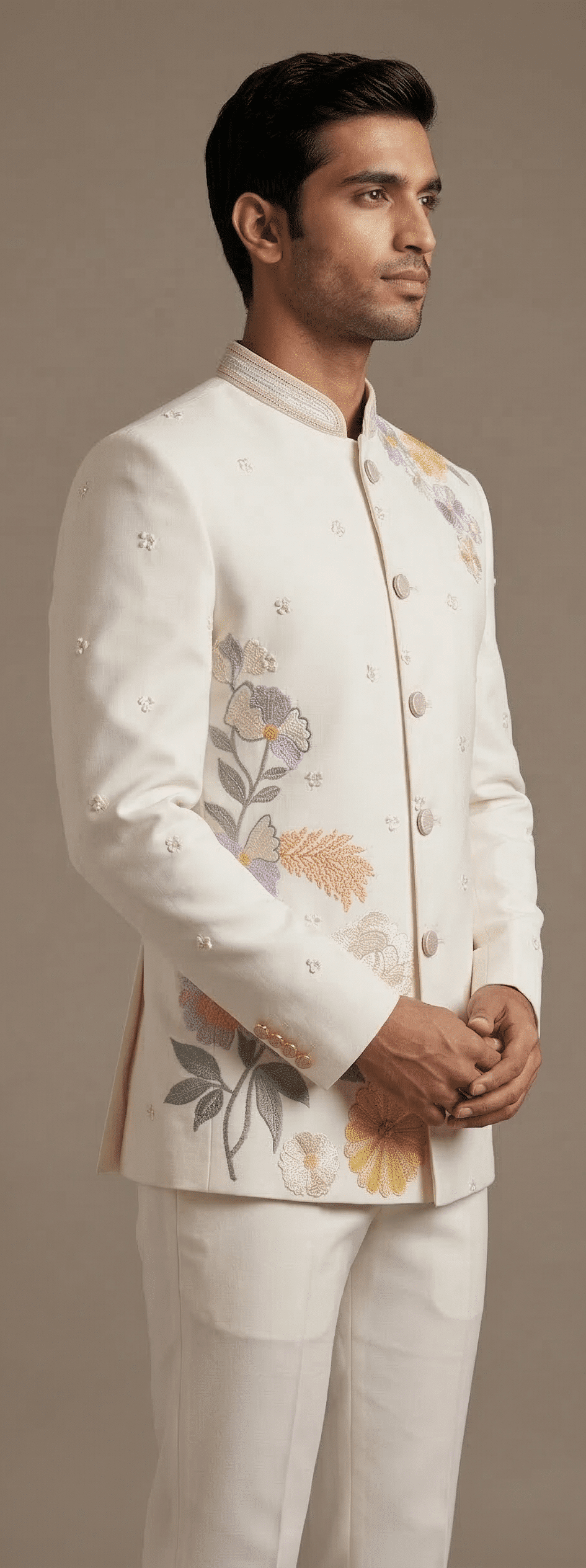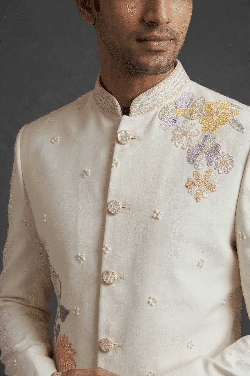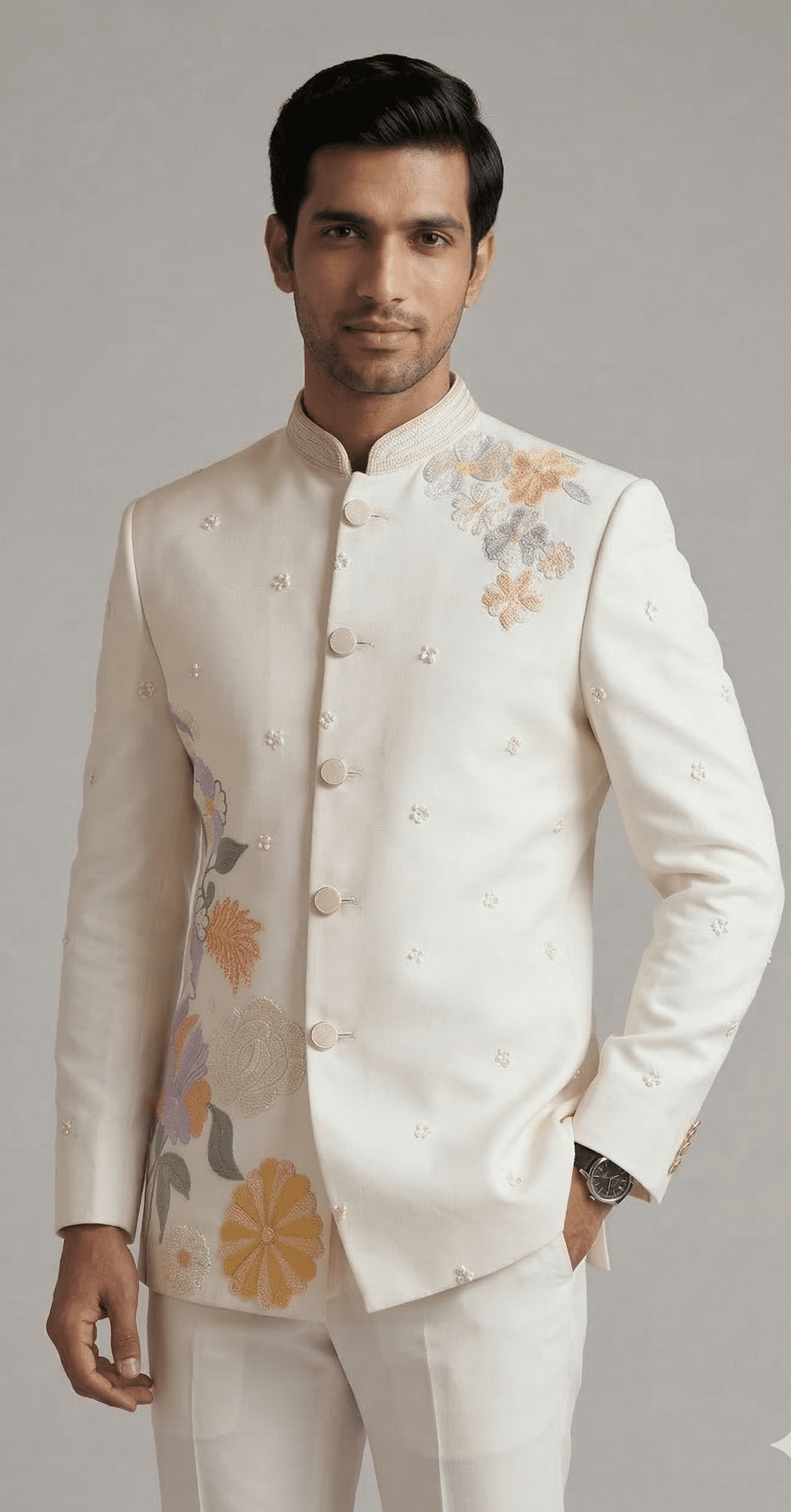 The regal mandarin collar, clean structured silhouette, and finely detailed embroidery create a perfect blend of traditional heritage and modern luxury. The subtle multicolor floral motifs enhance the overall design, making this suit an eye-catching yet sophisticated choice for weddings, receptions, engagement ceremonies, and festive celebrations.