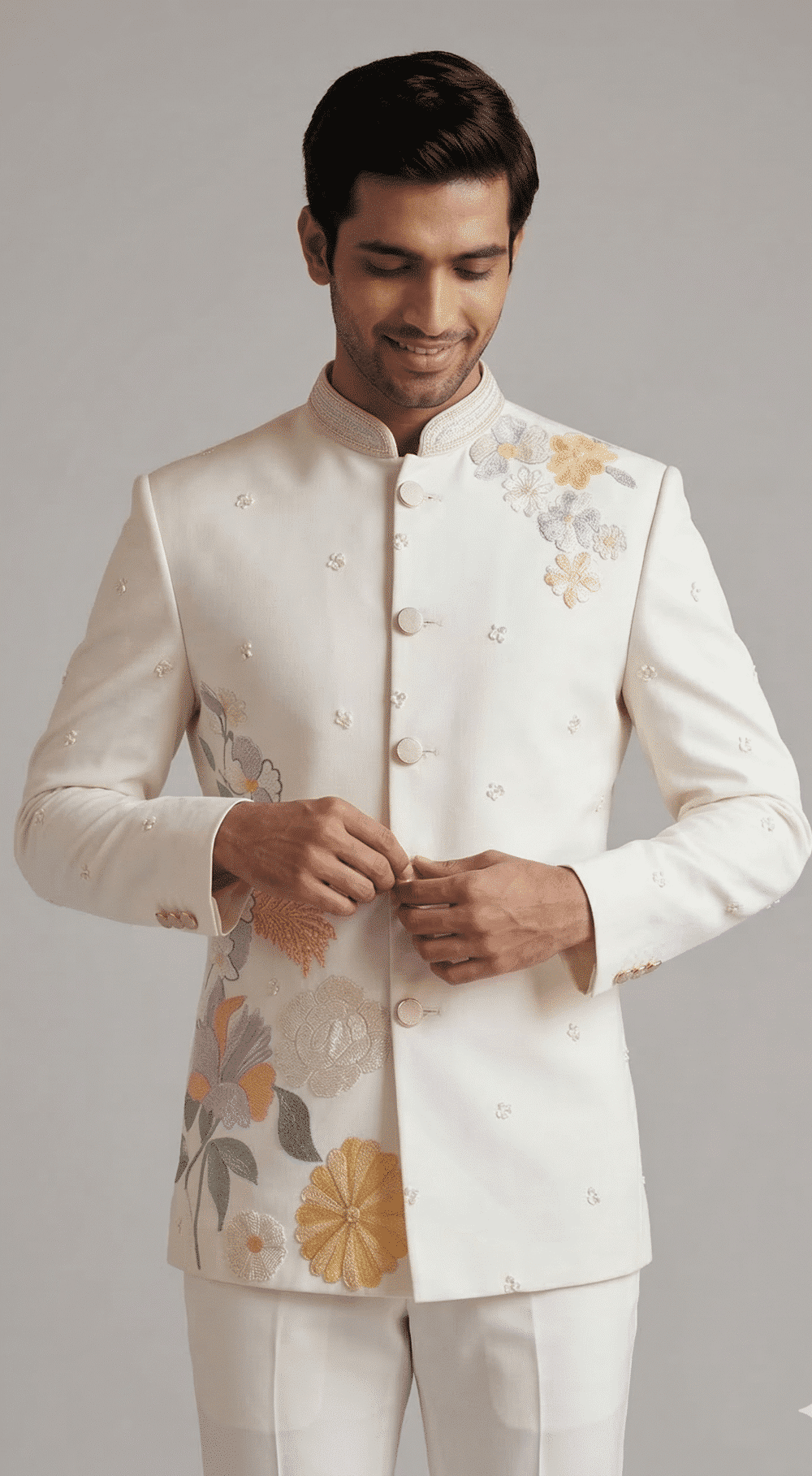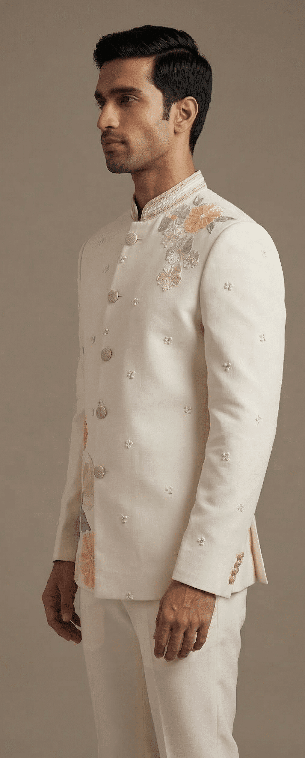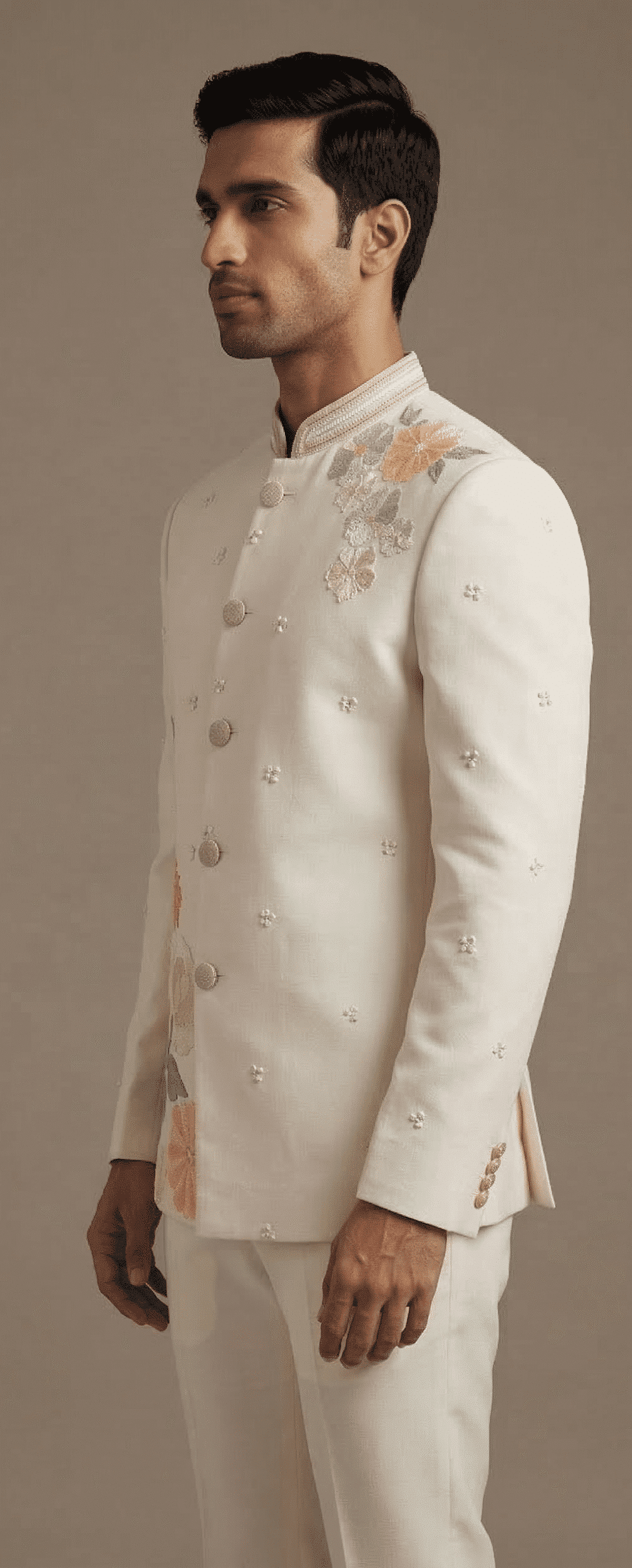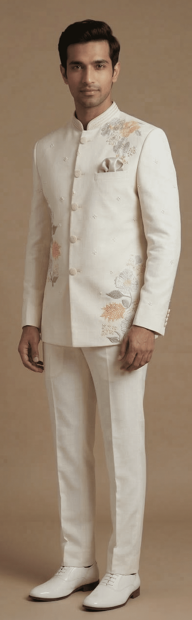 The regal mandarin collar, clean structured silhouette, and finely detailed embroidery create a perfect blend of traditional heritage and modern luxury. The subtle multicolor floral motifs enhance the overall design, making this suit an eye-catching yet sophisticated choice for weddings, receptions, engagement ceremonies, and festive celebrations.