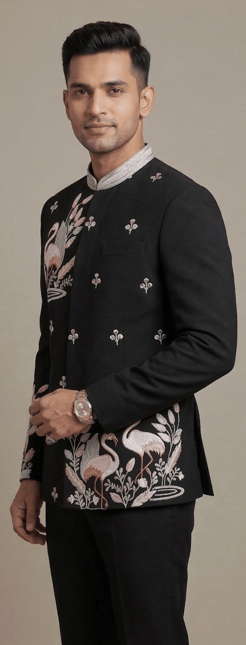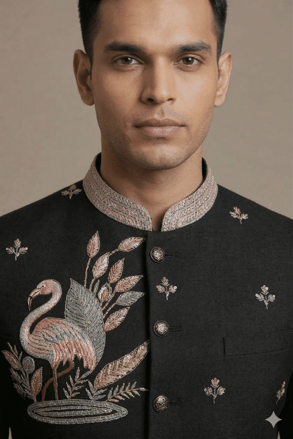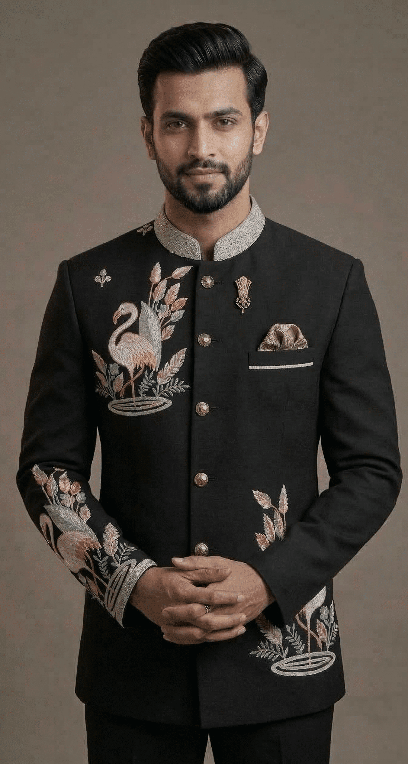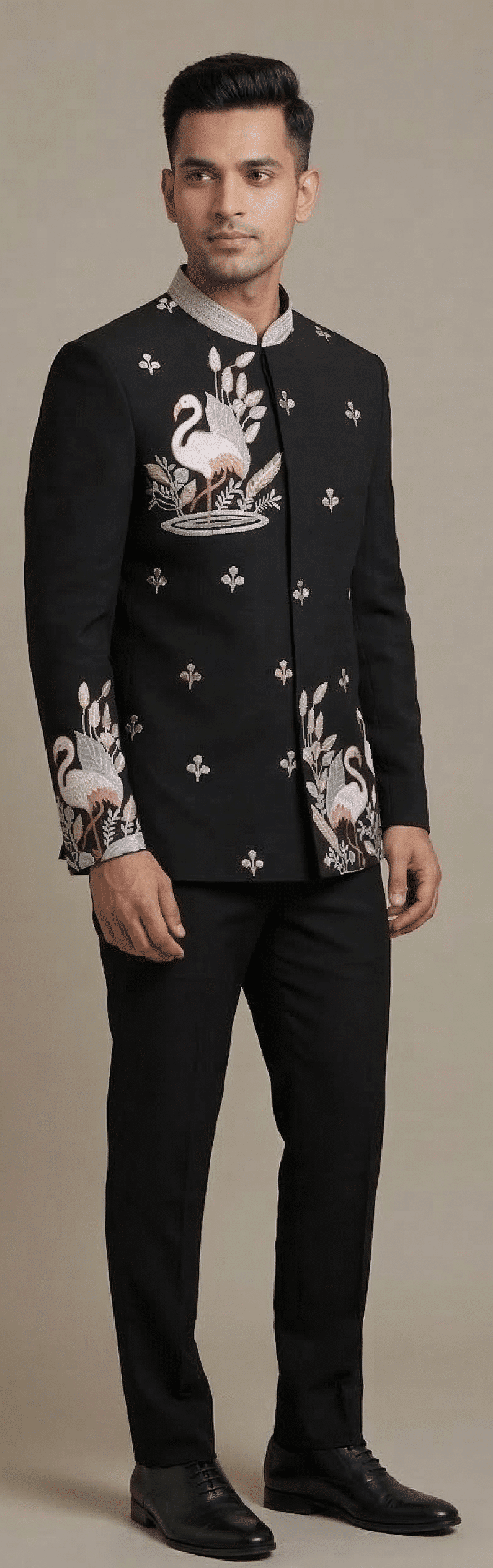 Make a bold royal statement with the Royal Flamingo Heritage Jodhpuri Suit, a masterpiece that blends luxury craftsmanship with artistic embroidery. Designed in a sophisticated deep black shade, this premium bandhgala suit features intricate flamingo and floral embroidery, creating a striking design inspired by royal heritage and nature.