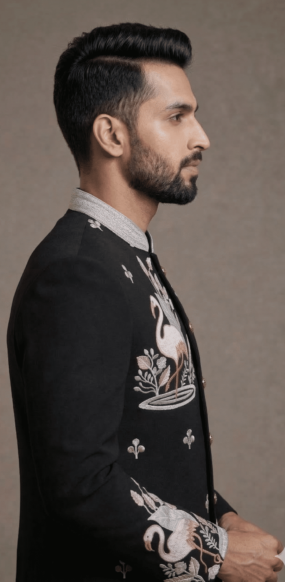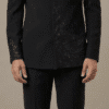 The elegant mandarin bandhgala collar paired with a structured silhouette adds a refined and commanding presence, while the beautifully detailed bird motifs elevate the suit into a true designer statement piece. The embroidery flowing across the chest, sleeves, and lower panel brings depth, texture, and distinctive character to the ensemble.
