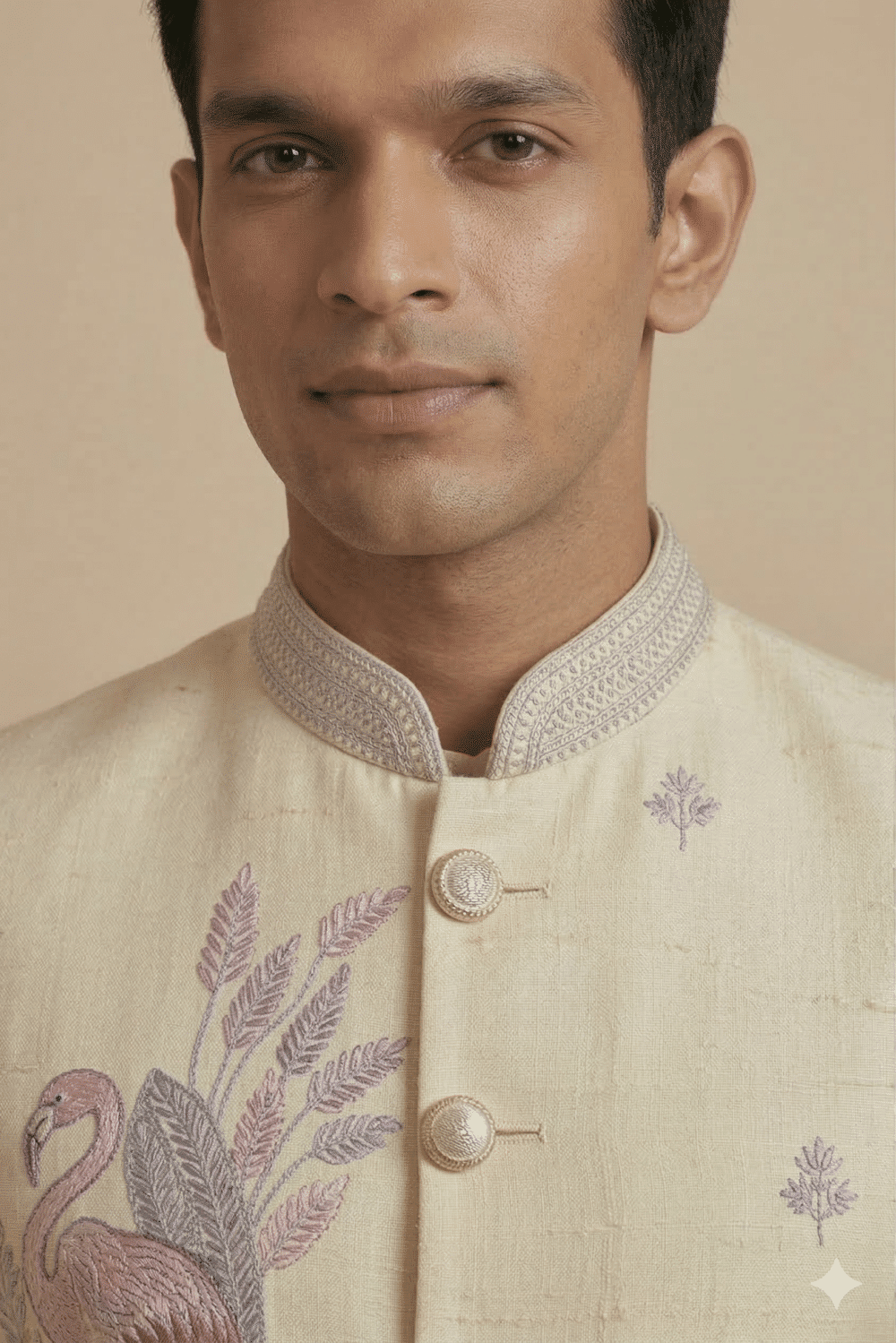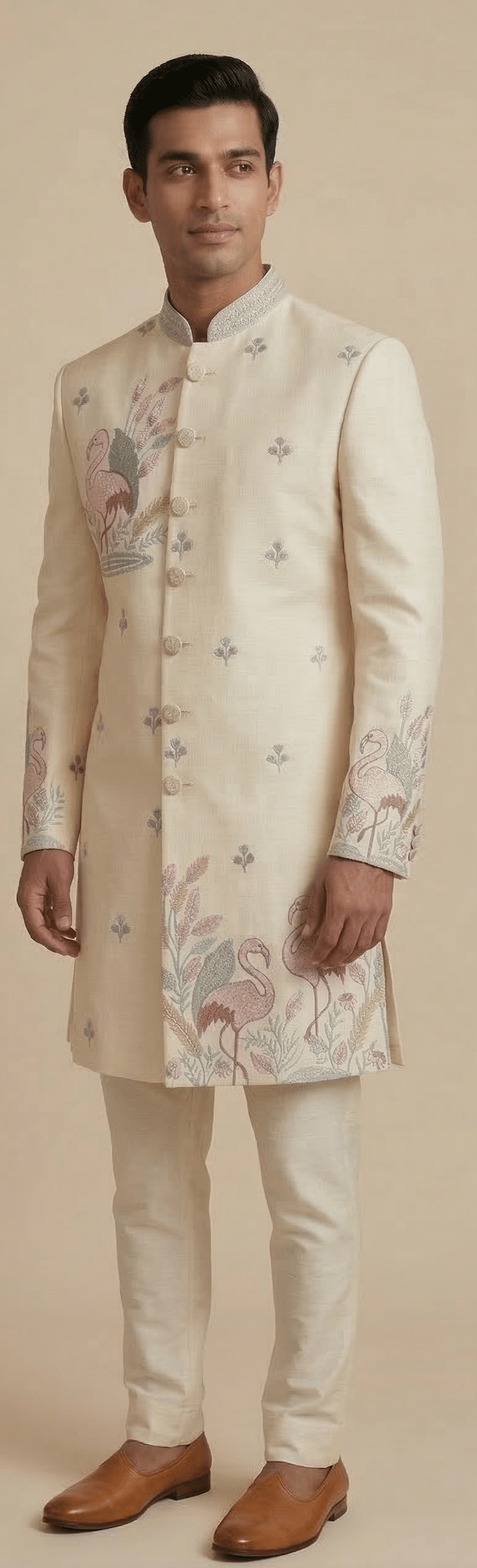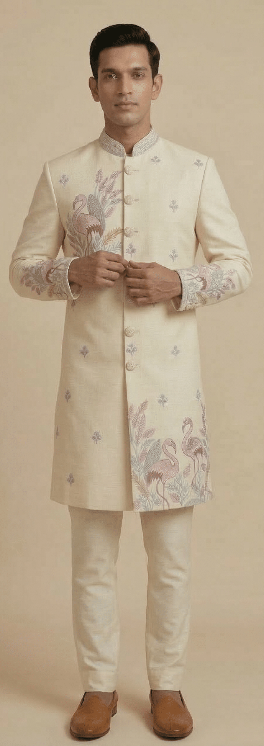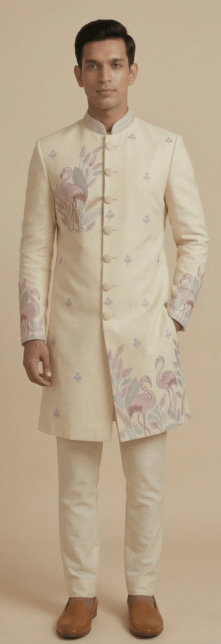 Step into refined elegance with this luxurious Ivory Indo-Western outfit, designed for modern men who appreciate a blend of tradition and contemporary style. Crafted in a rich, breathable fabric, this ensemble features intricate flamingo and floral embroidery that adds a unique artistic charm, making it a standout choice for weddings, receptions, and festive occasions.